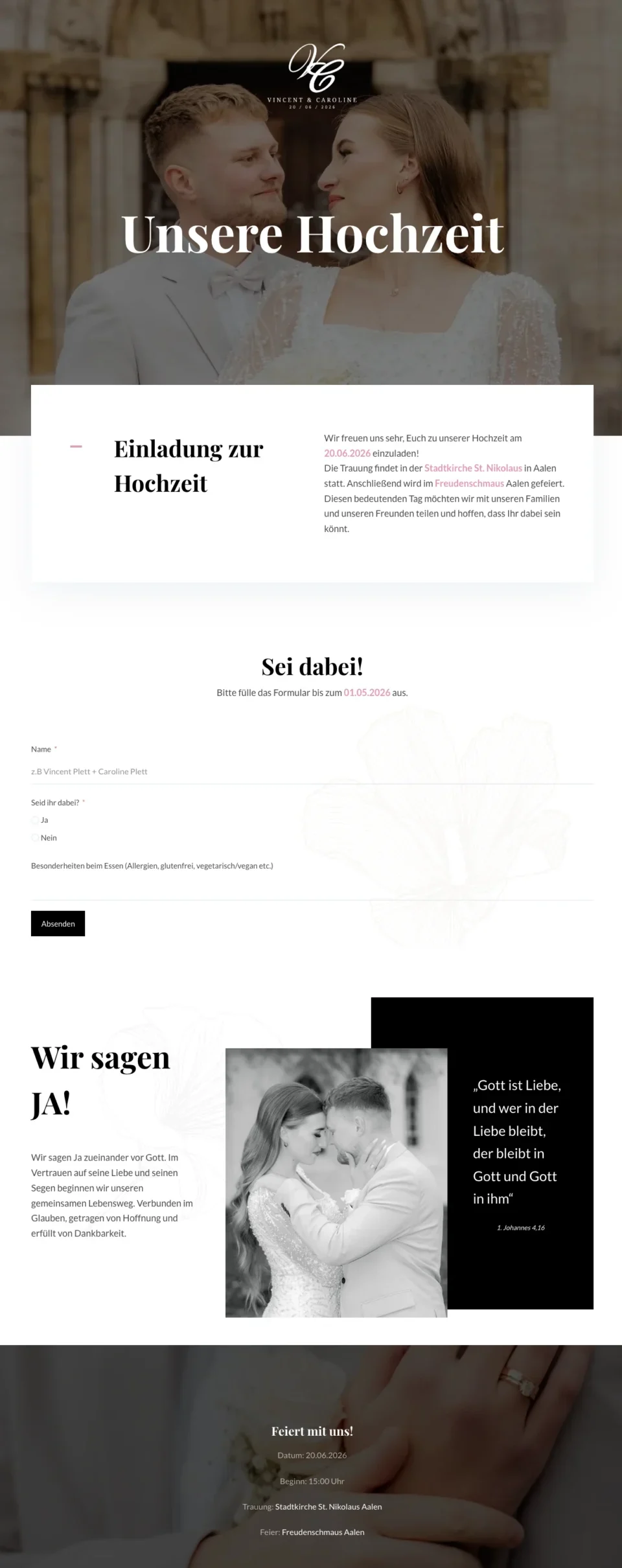 Eine elegante, persönliche Website für euren besonderen Tag. Mit Countdown, Dresscode, Anfahrt und Anmeldeformular. Alles an einem Ort.